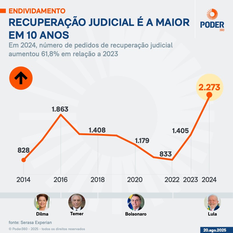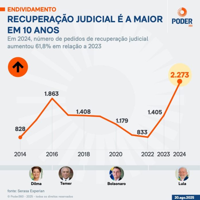 O número de pedidos de recuperação judicial no Brasil disparou em 2024, atingindo o maior patamar desde 2016. De acordo com levantamento da Serasa Experian, foram 2.273 solicitações no ano passado, contra 1.405 em 2023, o que representa uma alta de 61,8%.