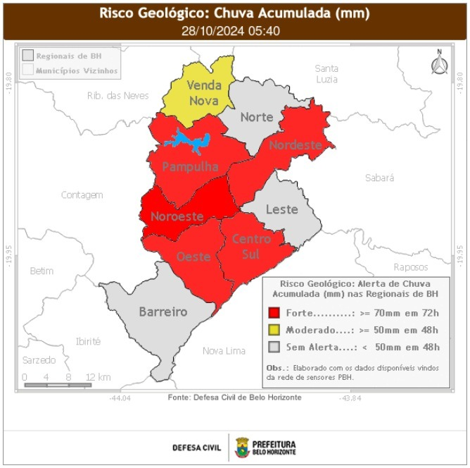A Defesa Civil de Belo Horizonte emitiu, na manhã desta segunda-feira (28), um alerta de risco geológico para seis das nove regionais da cidade, em decorrência das fortes chuvas registradas no último final de semana. As regionais Oeste, Noroeste, Centro-Sul, Nordeste e Pampulha estão em alerta de risco “forte” de deslizamentos e outros incidentes geológicos, enquanto a regional de Venda Nova está sob risco “moderado”. O aviso é válido até terça-feira (29) e pode ser renovado conforme as previsões de chuvas para os próximos dias.