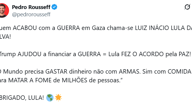 Na publicação, Rousseff utilizou uma espécie de “equação” para reforçar seu argumento: “Trump ajudou a financiar a guerra = Lula fez o acordo pela paz“. O vereador também citou declarações de Lula sobre a prioridade de investimentos em comida e não em armas.