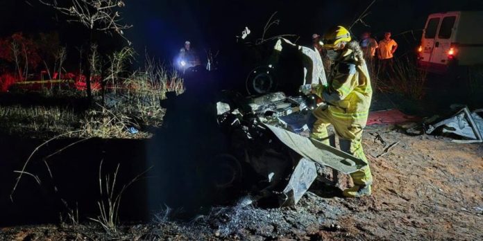 De acordo com o Corpo de Bombeiros, a cena encontrada era de “grande destruição”. O carro ficou completamente amassado, dificultando o resgate. Duas vítimas foram localizadas presas às ferragens e carbonizadas, impossibilitando a identificação imediata. Outras três – duas mulheres e a criança – foram arremessadas para fora do veículo devido ao impacto.
