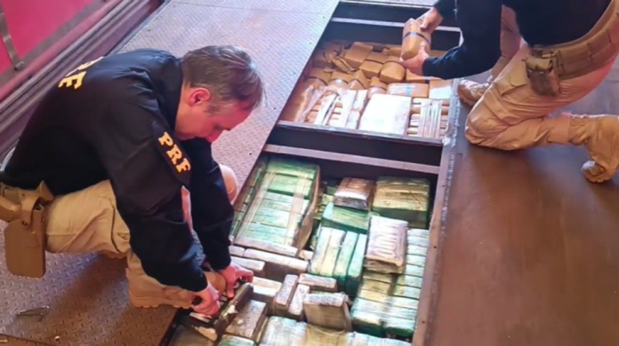 - Durante fiscalização, a equipe da PRF encontrou um fundo falso no semirreboque, contendo: