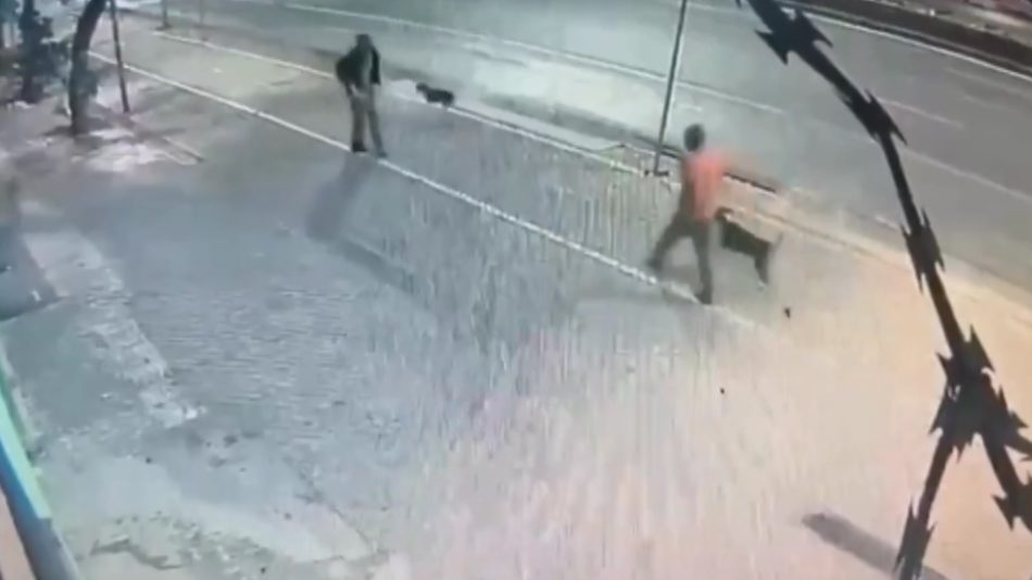 Imagens mostram o início do desentendimento. A vítima, vestindo camisa laranja, aparece perseguindo o autor do homicídio. Ambos estão armados com pedaços de madeira e são acompanhados por dois cachorros. Pouco depois, o vídeo registra as agressões.