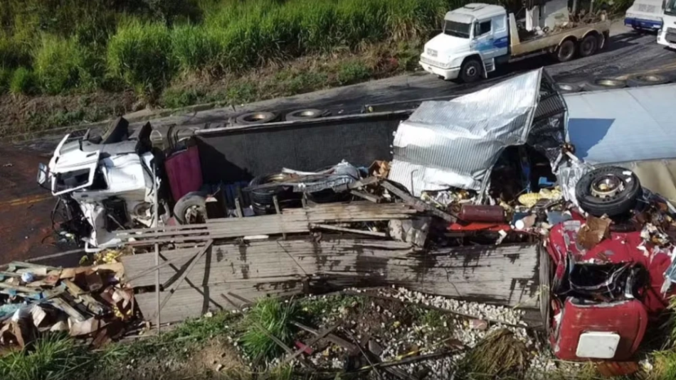 De acordo com informações da Polícia Rodoviária Federal (PRF), a colisão ocorreu quando um caminhão baú bateu contra um caminhão refrigerado e acabou tombando na pista. No impacto, o veículo atingiu um terceiro caminhão, que transportava uma carga de pedras e seguia no sentido oposto da rodovia.