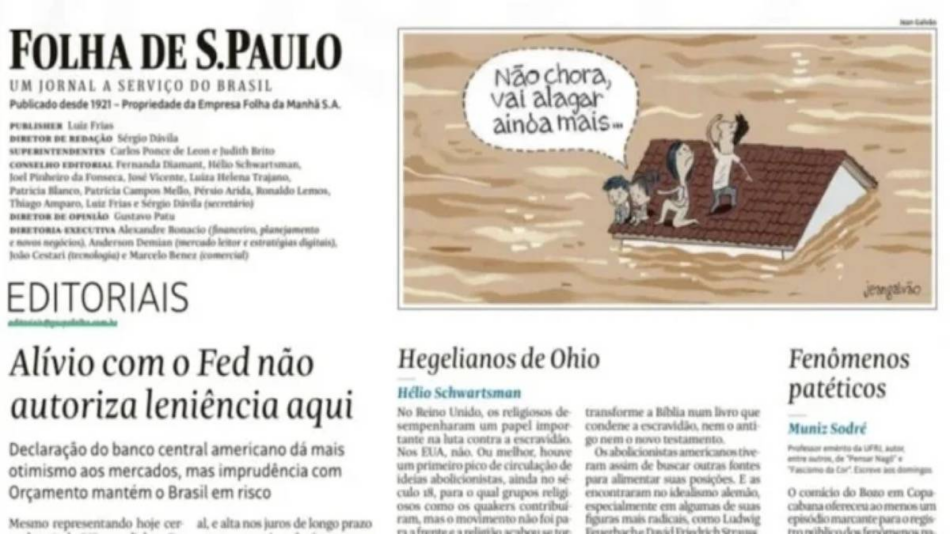 O pedido de desculpas veio após críticas generalizadas à charge nas redes sociais e no site da Folha. Na ilustração, uma família aparece no telhado de uma casa praticamente inundada pela enchente. Enquanto o pai parece implorar por ajuda olhando para o céu, uma das crianças, uma menina, diz ao irmão: “Não chora, vai alargar ainda mais”.