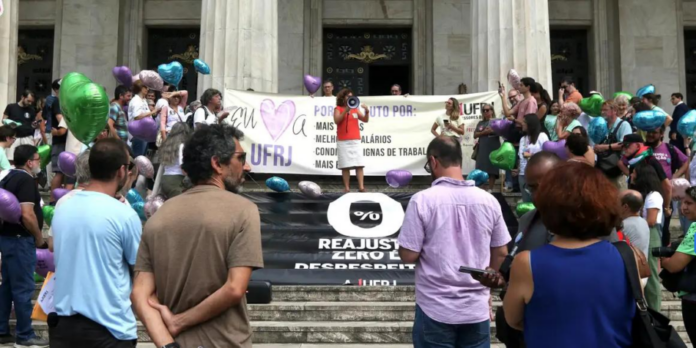 Nesta sexta-feira (19), a Associação de Docentes da Universidade Federal do Rio de Janeiro (ADUFRJ) organizou um ato em defesa da universidade, reivindicando salários dignos, mais bolsas de pesquisa e melhores condições de trabalho. Sob o lema “Eu amo a UFRJ”, os manifestantes decoraram as escadarias do Ministério da Fazenda, no centro do Rio, com faixas e balões coloridos.