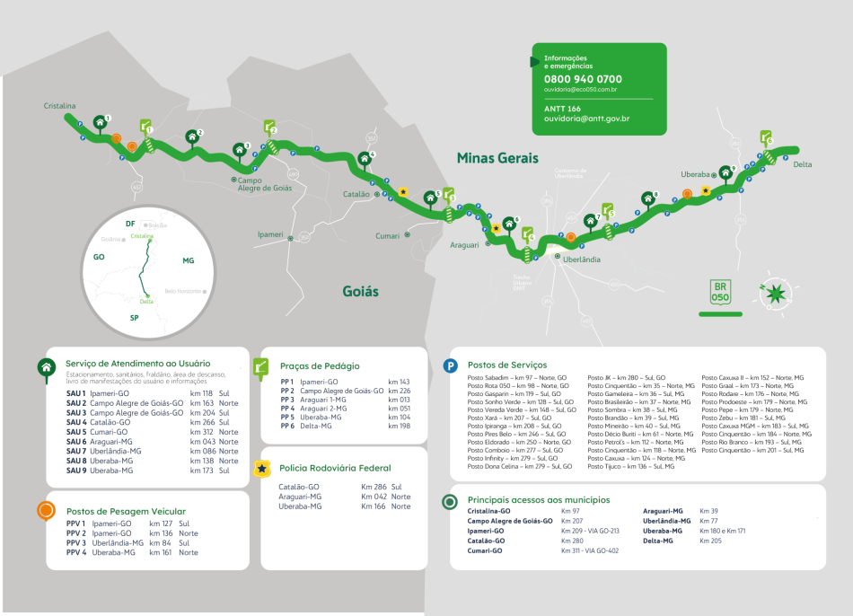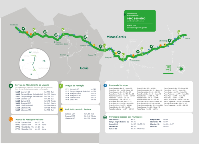 O trecho da BR-050 administrado pela ECO050 vai de Cristalina (GO) até a divisa de Minas com São Paulo, passando por municípios como Uberaba e Uberlândia.
