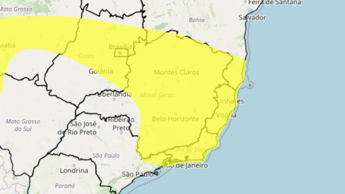 O INMET emitiu na sexta-feira (28/11) um alerta de nível amarelo para tempestades que vale até as 10h deste sábado (29/11) para boa parte de Minas Gerais — incluindo as regiões Metropolitana de Belo Horizonte, Norte, Jequitinhonha, Vale do Rio Doce, Triângulo Mineiro e outros setores do estado. Estão previstas chuvas que podem alcançar entre 20 e 30 mm/h ou até 50 mm no acumulado do dia, além de ventos de 40 a 60 km/h e possibilidade de granizo. Há risco de queda de galhos, alagamentos e interrupções no fornecimento de energia.
