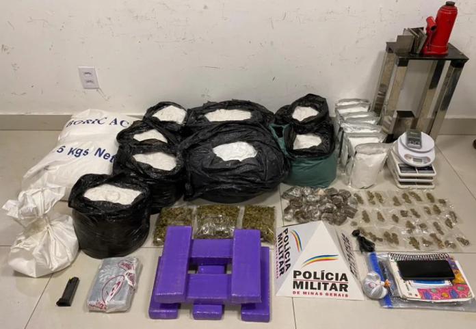 No local, foram apreendidos 60 quilos de cocaína, além de uma barra adicional da droga, 51 porções de maconha, três porções de maconha hidropônica e materiais usados no refino e na distribuição, incluindo uma prensa hidráulica, cinco balanças de precisão e produtos químicos.