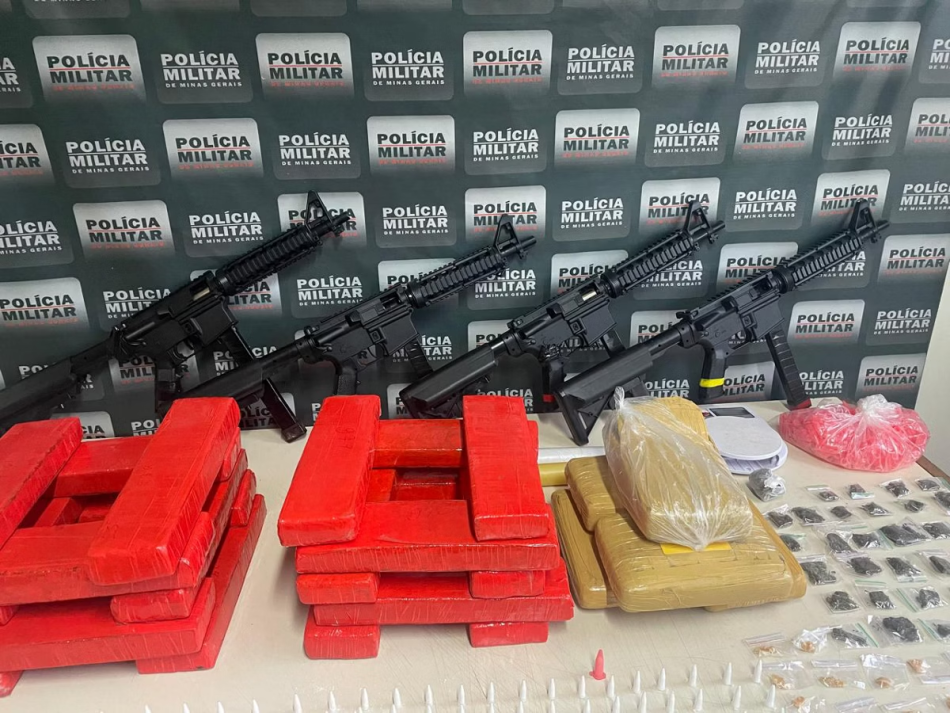 Já na residência do suspeito, no bairro Brasília, em Sarzedo, os militares apreenderam aproximadamente 20 kg de maconha, 150 pinos de cocaína e as quatro submetralhadoras de calibres 9 mm e .40.