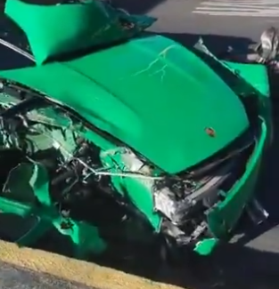 O impacto da colisão foi tão forte que arrancou as duas rodas dianteiras do Porsche e destruiu a parte frontal do veículo, além de acionar os airbags.
