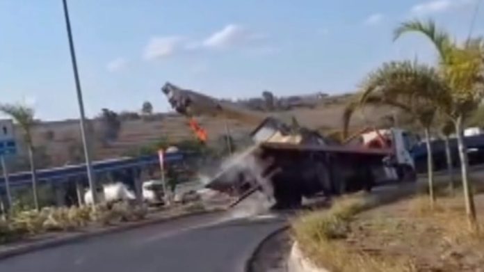 Um caminhão-reboque que transportava um trator agrícola tombou após o veículo se soltar da carroceria durante o trajeto. O motorista perdeu o controle da direção, e o caminhão acabou tombando às margens da rodovia.