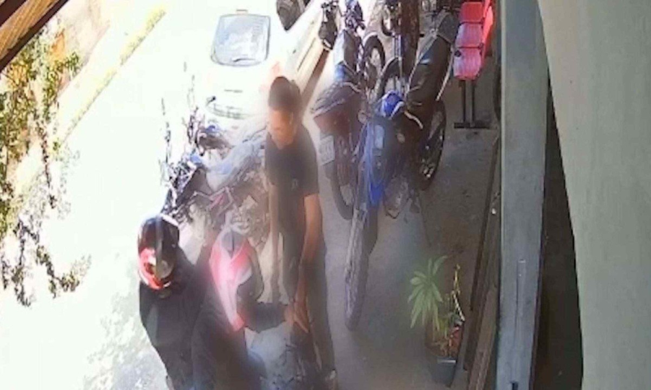 As gravações mostram Nilson conversando com dois homens em uma motocicleta azul, modelo XRE. A dupla usa roupas semelhantes — blusa preta, calça jeans e capacete. A conversa se estende por aproximadamente cinco minutos, conforme indica o relógio da câmera.