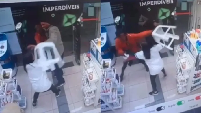 O assalto ocorreu em uma unidade da Rua Grão Mogol. As imagens mostram o casal entrando no estabelecimento e recolhendo produtos das prateleiras. Ao ser empurrada durante a abordagem, a atendente reage instintivamente com um banco de plástico, desferindo golpes contra os dois suspeitos.