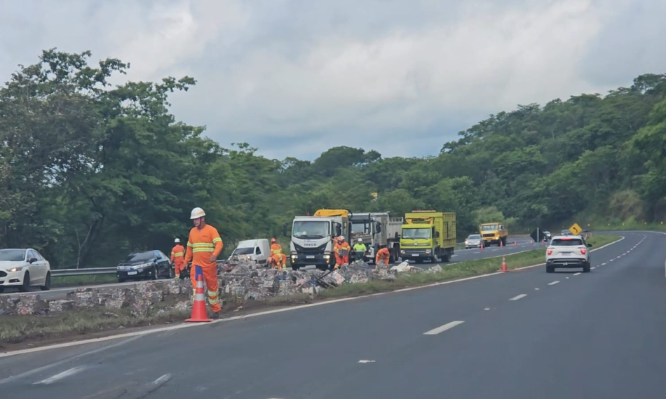 A carga, composta por blocos de latas compactadas, se espalhou pela pista contrária, o que exigiu a interdição total do sentido oposto durante toda a madrugada e parte da manhã para a limpeza e remoção do material.
