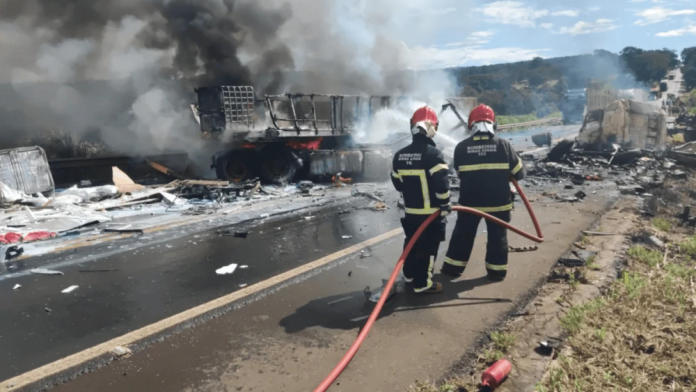 Um grave acidente envolvendo dois caminhões deixou duas pessoas mortas na tarde deste sábado (24) na BR-365, no interior de Minas Gerais. A colisão ocorreu no trecho entre os municípios de Guimarânia e Patos de Minas, a aproximadamente 420 quilômetros de Belo Horizonte, e foi seguida de explosões e incêndio de grandes proporções.