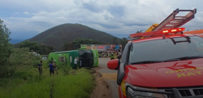 Na tarde deste sábado (13), um ônibus de viagem tombou no km 43 da BR-356, em Itabirito, na região Central de Minas Gerais, deixando 16 pessoas feridas.
