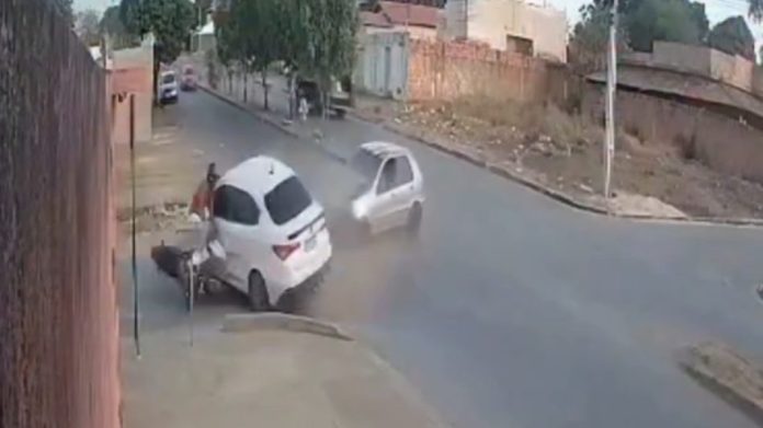 O vídeo mostra o momento exato da colisão: o motorista do Corsa seguia pela avenida, enquanto o Cronos, ao tentar acessar a rua, chocou-se com o outro carro e foi lançado em direção à calçada, atingindo o motociclista.